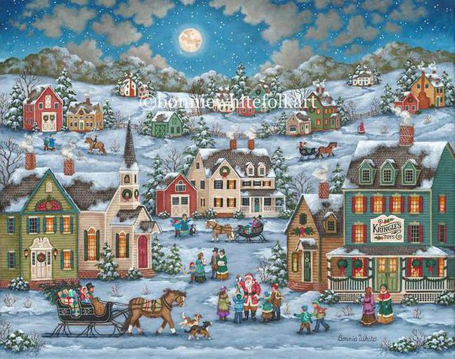 On this starry night beneath a full moon, the freshly fallen snow has drawn people outdoors. Some stroll through the village, while a couple enjoys a sleigh ride. Nearby, a family takes advantage of a recently cleared pond, ready for an evening of skating.