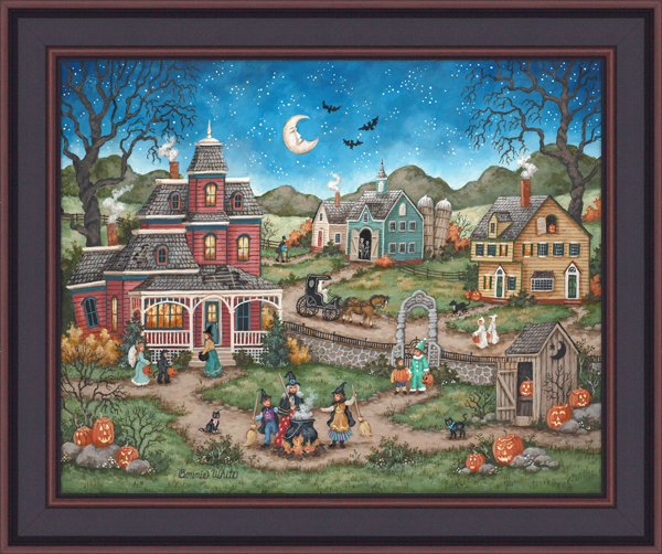 It's Halloween night and local children hurry past this spooky home on their way to trick or treat. Out back the old witch is teaching her three granddaughters how to brew up a big black pot of spookiness. The Pumpkins are set out to scare those who come down their path.....and what's that in the window?