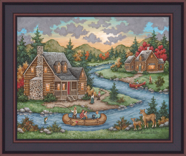 Bright orange, brilliant reds and blazing golds emerge in the fields above, signaling the beginning of fox hunting season. In the valley below, children admire a fish they've caught while their brother sits on his pony, dreaming of joining the hunt some day. A family of foxes watch from a safe place, hoping for a fish that might be left behind.