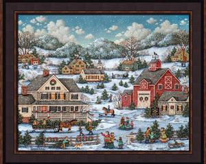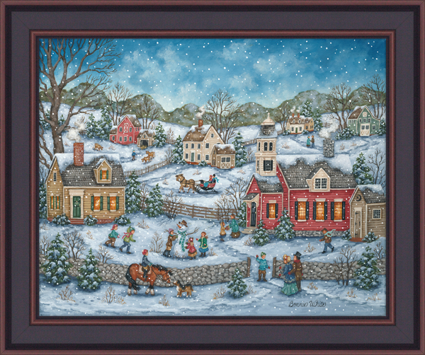 Christmas is just around the corner and this town is bustling with last minute shoppers. Just above on the left, a farmer brings his horses in for the night while in the field to the right, children get in a few more runs with their sleds before dinner. As the pastor of the little white church waves at a family traveling by, down below, there's commotion as a gentleman dressed in red with a sled full of toys passes through.
