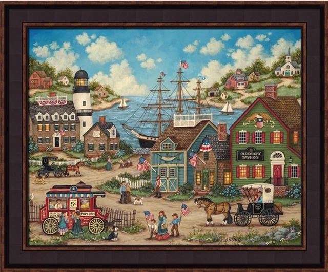 As a family arrives and unloads their buggy for a stay at the Frisky Mermaid Inn, a captain and his wife join their grandchildren for a stroll on the beach. A bucket formaking sand castles and a toy sailboat make for an eventful day. In the foreground, “Ships Ahoy!”