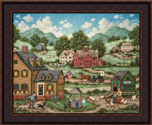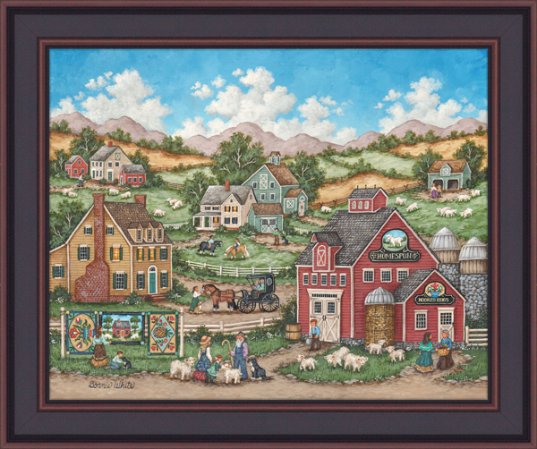 Homespun sheep farm is open for business. As the farmers wife brings out a basket of colorful yarn for a customer to choose from, her husband chats with a women interested in purchasing one of the intricate hooked rugs. Children, uninterested in the business at hand, make friends; one with the resident barn cat and another with a curious lamb.