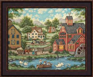 A full moon shines down on this barn that's come to life after evening chores. Horses wait patiently as their passengers enjoy a Friday Night Hoe-Down. The barn is so full that some couples have moved outside to dance. A farmer arrives with his large family loaded in a haywagon. As they begin to unload, his oldest daughter has gone ahead to meet up with a neighborhood boy.