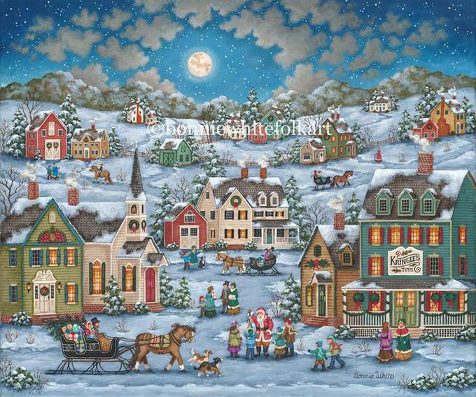 Several horse drawn sleighs pass through, one loaded up with presents and a freshly cut evergreen tree, as families get ready for the big day. Every building is decked out in holiday decor including wreaths, sprays of balsam, kissing balls and a pineapple surrounded by apples representing the warmth and hospitality of the season. As their mother speaks with Mrs. Kringle, her sons run to see what new toys Kris Kringle has to offer this year.