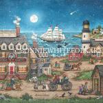 While three seagulls fly overhead, others gather on the rooftop of "Gulls Landing Lighthouse" looking for handouts. While one man heads home with his freshly painted dingy, his children enjoy the ride as they tempt the scavengers with leftover crusts.